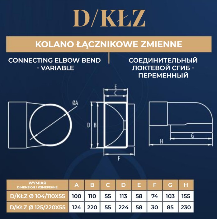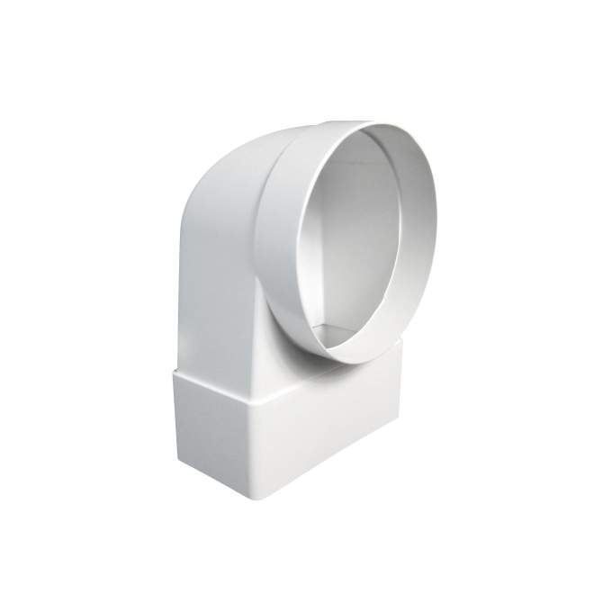 Kolano D/KŁZ 220×55 łączy ze sobą kanały płaskie D/P 220×55 z kanałami okrągłymi D/O 125 albo z kratkami/wentylatorami o fi 125.