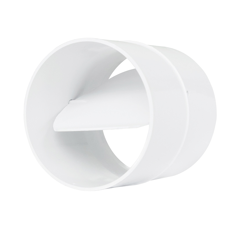 Łącznik kanałów okrągłych z przepustnicą wykonany z białego tworzywa ABS.