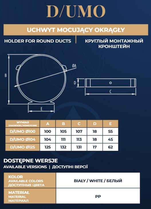 Uchwyt dostępny jest o fi 100mm, 104mm i 125mm. Służy do przymocowania kanałów okrągłych D/O do stabilnego podłoża.
