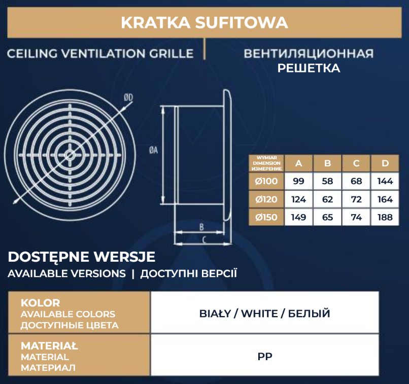 Kratka sufitowa charakteryzują się nowoczesnym wzornictwem. Znajdują zastosowanie w budowie systemów wentylacyjnych w budownictwie mieszkaniowym, budynkach użyteczności publicznej, domkach jednorodzinnych oraz innych obiektach użytkowych. Kratka sufitowa została wykonana z materiału odpornego na wszelkie uszkodzenia. Łatwa w montażu. 50-letnie doświadczenie firmy DOSPEL w produkcji to gwarancja najwyższej jakości.